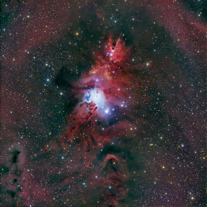 NGC2264 is collective designation for a big star forming region in the constellation of Monoceros. Most prominent objects in the region are the Christmas Tree Cluster, the Cone Nebula and the Fox Fur Nebula. Christmas Tree Cluster is an open cluster of some 40 young stars. Stars of the cluster are responsible for exciting gas and dust in the region and generating light. At the bottom of the Christmas Tree there is a giant star S Mon which is 8700 times more luminous than the Sun. Where obscuring dust clouds lay close to young stars, they reflect their light, forming the bluish reflection areas of the nebulosity. At the top of the Christmas tree there is the Cone Nebula. The Cone Nebula is a pillar of dust, 7 ly long, shaped by wind of particles from some nearby energetic source. Fox Fur Nebula is situated close to the reflection area at the bottom of the Christmas tree. Its interesting shape is formed by complex interactions of dust, light and jets of hot gas from the nearby young stars. NGC2264 is 2700 ly distant and has some 70 ly across.