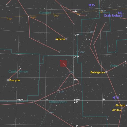 NGC2264 je zajednička oznaka za veliko područje gdje se rađaju mlade zvijezde u sazviježđu Jednoroga. Najuočljiviji objekti unutar tog područja su skup Božićno drvce, maglina Stožac te maglina Lisičje krzno. Skup Božićno drvce je skup od oko 40 mladih zvijezda. Zvijezde tog skupa su odgovorne za pobuđivanje plina i prašine u tom području, te emitiranje svjetla. Na dnu Božićnog drvca nalazi se divovska zvijezda S Jednoroga koja je 8700 puta svijetlija od Sunca (najsvjetlija na fotografiji). Tamo gdje neprozirni oblaci prašine leže blizu mladih zvijezda, oni odražavaju njihovo svijetlo, te stvaraju plavičasta refleksiona područja magline. Na vrhu Božićnog drvca nalazi se maglina Stožac. Maglina Stožac je stup prašine dug 7 sg, oblikovan vjetrom energičnih čestica iz nekog obližnjeg izvora. Maglina Lisičje krzno nalazi se odmah do refleksionog područja na dnu Božićnog drvca. Njen interesantan oblik stvoren je složenim prožimanjem prašine, svjetla te mlazova usijanog plina kojeg izbacuju obližnje mlade zvijezde. NGC2264 je 2700 sg udaljen, a promjer tog područja je nekih 70 sg. |