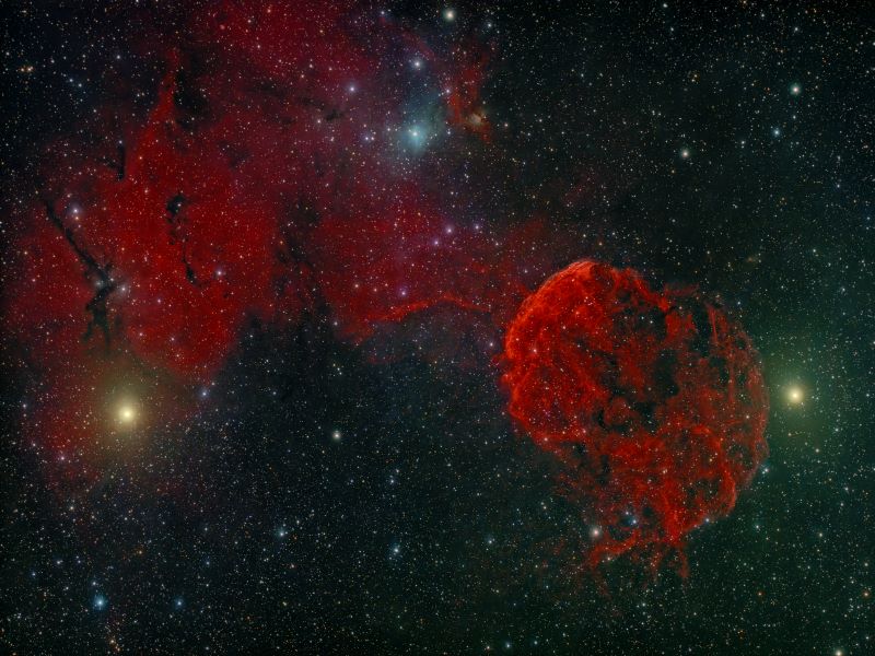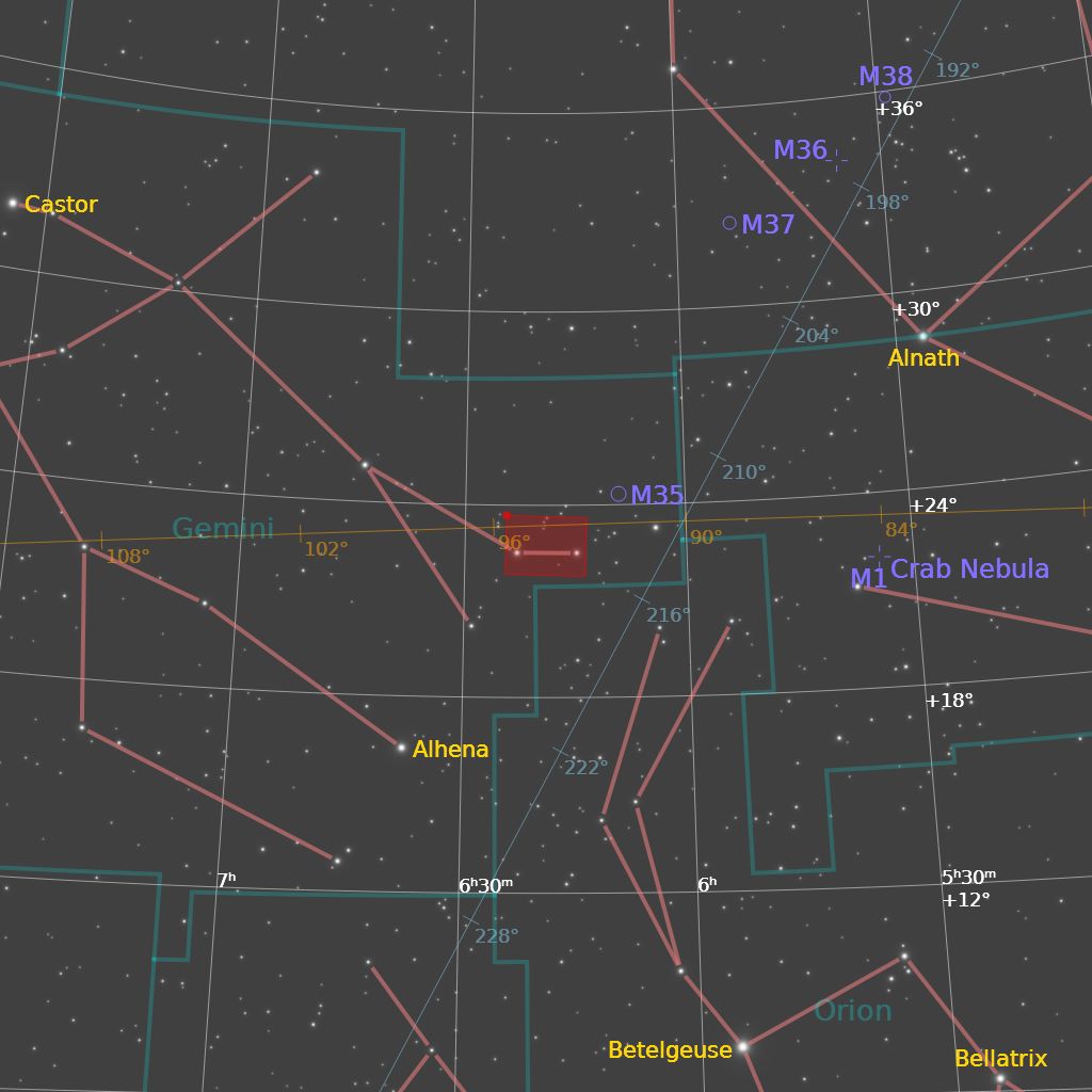 IC 443 je ostatak supernove, oblak krhotina masivne zvijezde koja je eksplodirala prije više tisuća godina. Većina drugih ostataka supernove širi se u prazan prostor, ali IC 443 prodire u gusti plin molekularnog oblaka, stvarajući složene udarne strukture. Starost ostatka nije sigurna, procjenjuje se da je između 3000 i 30000 godina. IC 443 je udaljena od nas 5000 sg s promjerom od 70 sg. IC 444 je kompleks reflektirajuće i emisione magline blizu IC 443. Plavičasti refleksijski dio IC 444 također ima oznaku vdB 75. Sjaji raspršujući zvjezdanu svjetlost obližnjih sjajnih zvijezda. Procjenjuje se da je udaljenost IC 444 kao i IC 443, oko 5000 sg, a promjer od 45 - 50 sg. Sh2-249 je ogromna i slaba emisijska maglica u istom području. To je molekularni oblak u koji IC 433 prodire. Na udaljenosti od 5200 sg proteže se na oko 250 - 300 sg u širinu. Ta je maglina je vrlo difuzna, teško je odrediti njezine stvarne granice. |