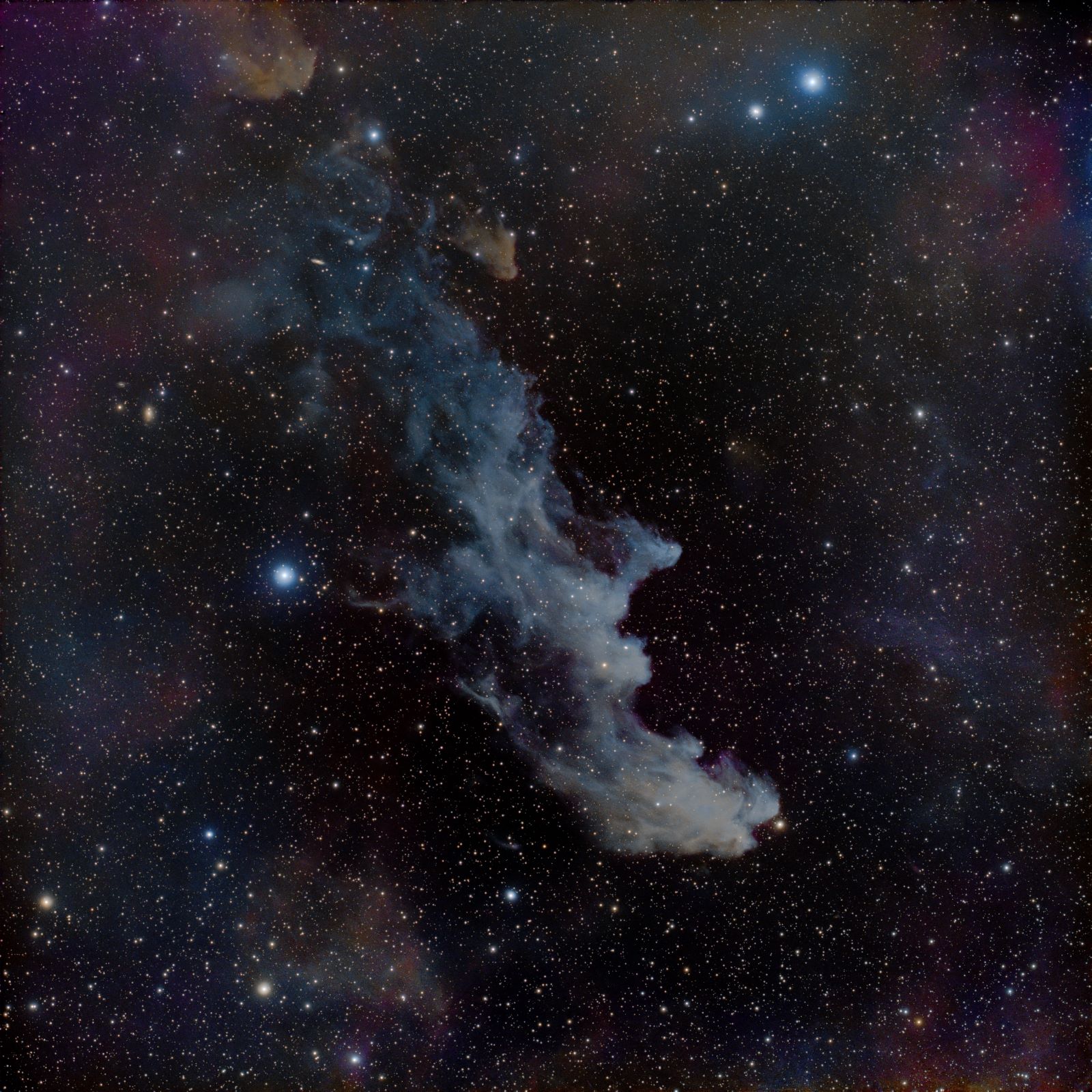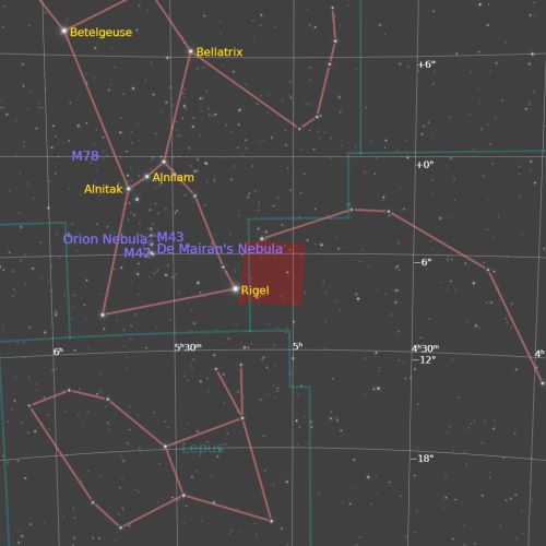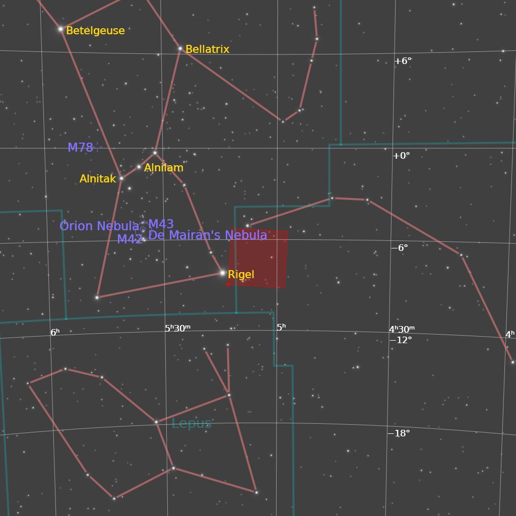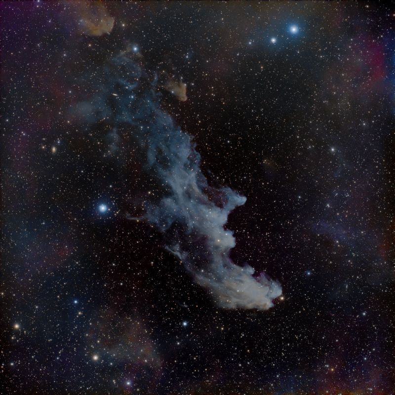 Maglina Vještičja glava je slaba refleksijska maglina koja se sastoji od međuzvjezdane prašine koja reflektira svjetlost plavog superdiva Rigela. Plavičasta boja magline djelomično je posljedica efekta raspršenja (čestice prašine bolje reflektiraju plave valne duljine), a djelomično zbog boje Rigelove svjetlosti. Maglica je udaljena 900 sg od nas i ima promjer od oko 50 sg. |